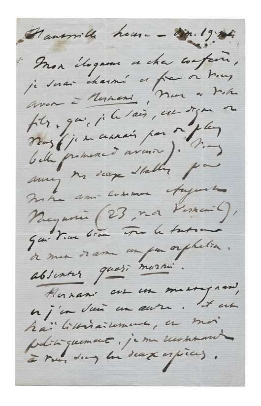 Unpublished autograph letter signed “Emile Zola” to Eugène Pelletan