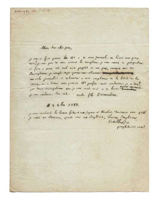 Autograph letter signed “Votre fils Desmoulins” to his father Jean-Benoist-Nicolas Desmoulins