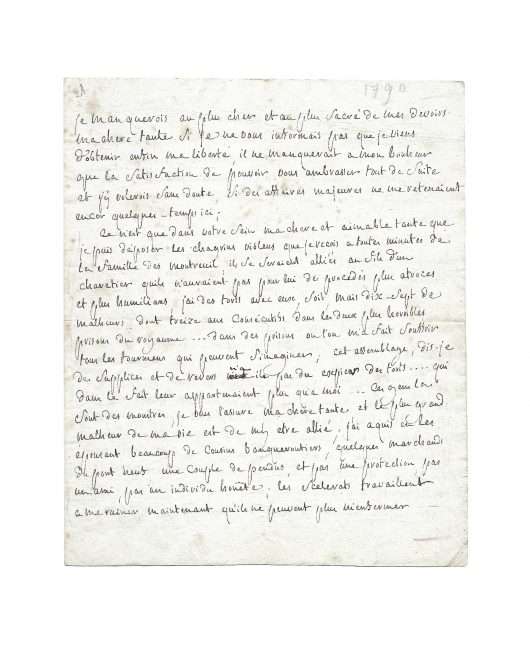 Autograph letter signed « de Sade » to his aunt Gabrielle-Eléonore de Sade