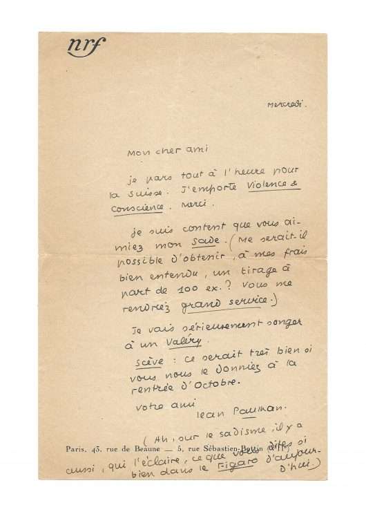 S.l., « Wednesday » [June ? 1945], 1 p. in-8° on NRF letterhead
