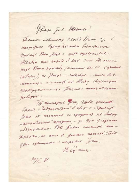 N.p, 20th May 1931, 1 p. in-folio, red ink, in russian