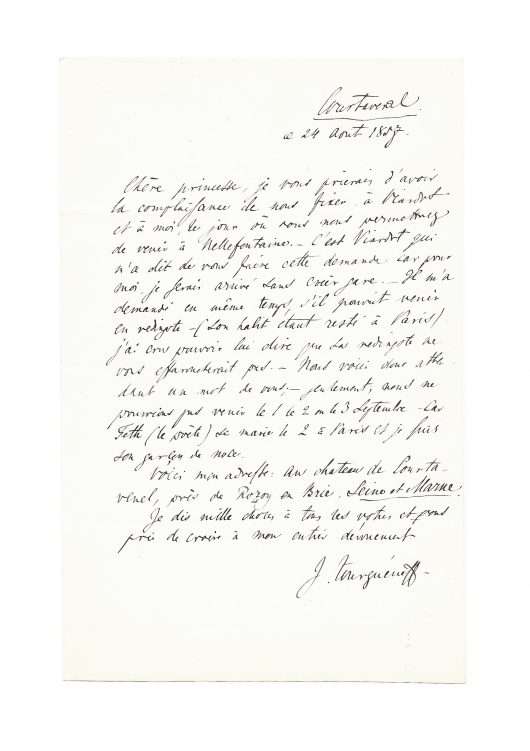 Autograph letter signed « Y. Tourguenieff » to Princess Troubetzkoy