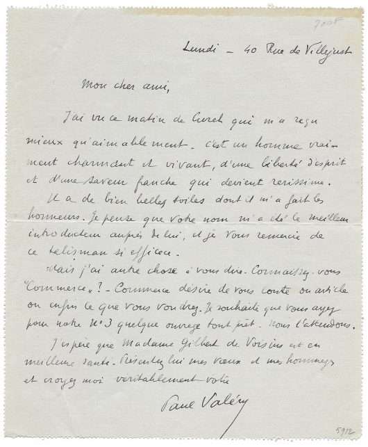 Autograph letter signed « Paul Valéry » to Comte Gilbert de Voisins