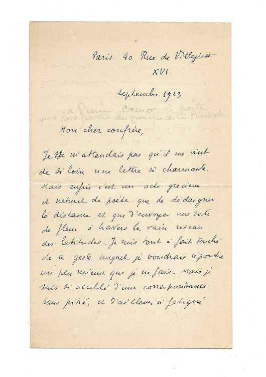 Paris, 40 rue de Villejust, September 1923, 3 pages in-8